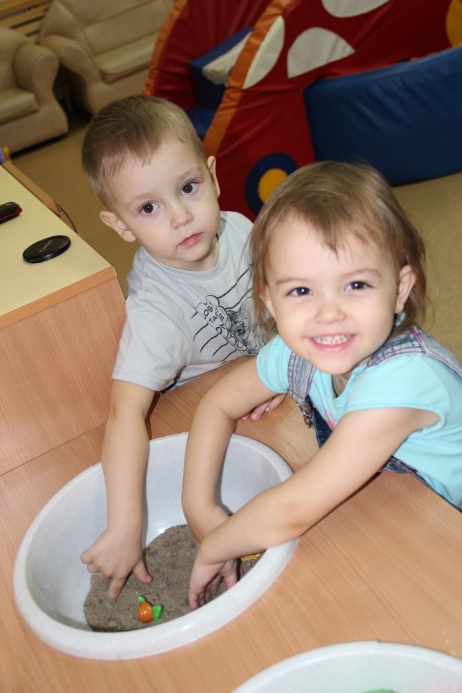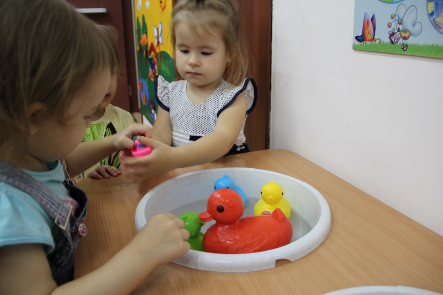 Ранний возраст – период активного экспериментирования ребенка с предметным миром. Все, что окружает малыша, вызывает у него интерес. Он любит исследовать новые предметы, экспериментировать с разнообразными веществами и материалами: водой, песком, снегом, глиной, красками. Особое удовольствие детям доставляют игры в Центре воды и песка. Здесь мы проводим со своими малышами простейшие опыты. Дети очень любят доставать предметы из воды, переливать воду в различные сосуды. Из песка мы строим различные постройки, также ищем в песке мелкие предметы, разыскивая в нем игрушку-сюрприз, рисуем на песке. Они очень любят пускать кораблики, наблюдать, как плавают в воде мама-утка со своими утятами.