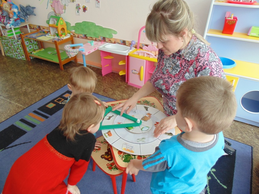 Также используем наглядное пособие «Круги Луллия», с помощью которого у детей формируется осознанное отношение к процессу комбинирования информации. Например, на сектора первого, самого большого круга, прикрепляются изображения животных (собака, кошка и др.); на сектора второго – их детенышей (щенок, котенок и т.п.); третьего – пищу, которую едят эти животные (кость, молоко и т.д.). Нельзя не отметить универсальность игрового пособия: используя лишь несколько кругов, можно получить либо разные варианты игры, либо дополнение к проводимой игре. Полученные навыки дети закрепляют в самостоятельных играх с «Речевыми кругами» в свободное время. А самое главное, использование данного пособия способствует формированию умения ребенка строить предложения, так как в основе лежит алгоритм.