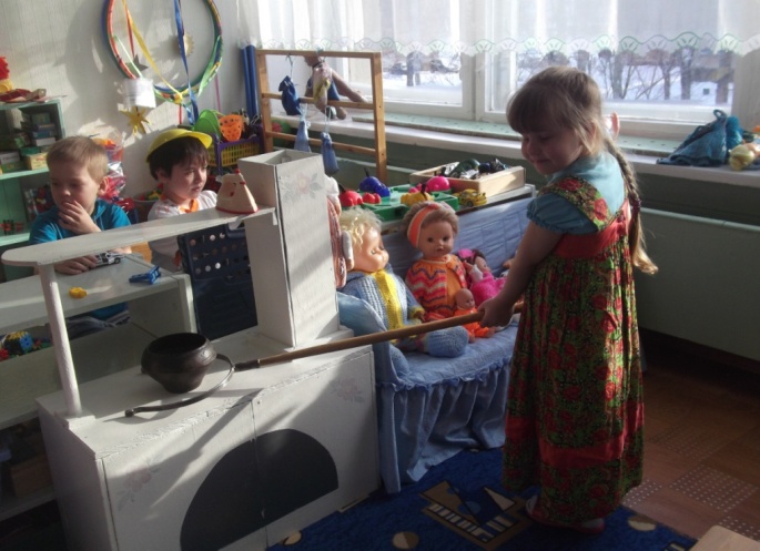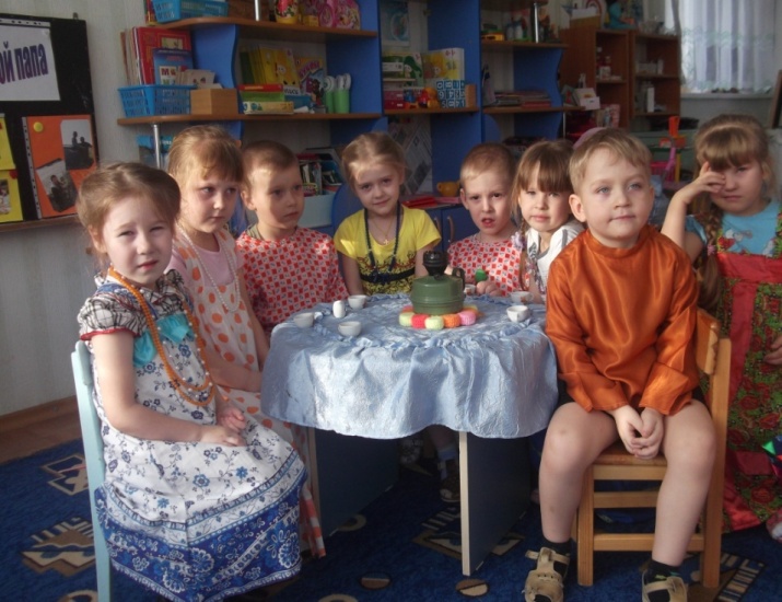 Многие названия: лапти, кушаки, утюги, крынки, выражения «Полное лукошко дам тебе горошка», «Позолоченная прялица», – знакомы детям по сказкам, потешкам, но не всегда понятны. А вот когда можно поиграть с реальными предметами, взять их в руки, образы оживают, становятся понятными и родными. И я заметила, после этого и по-иному звучат песенки, потешки, поговорки из уст наших детей. Они выразительнее передают характер взятой на себя роли, с удовольствием делятся знаниями.