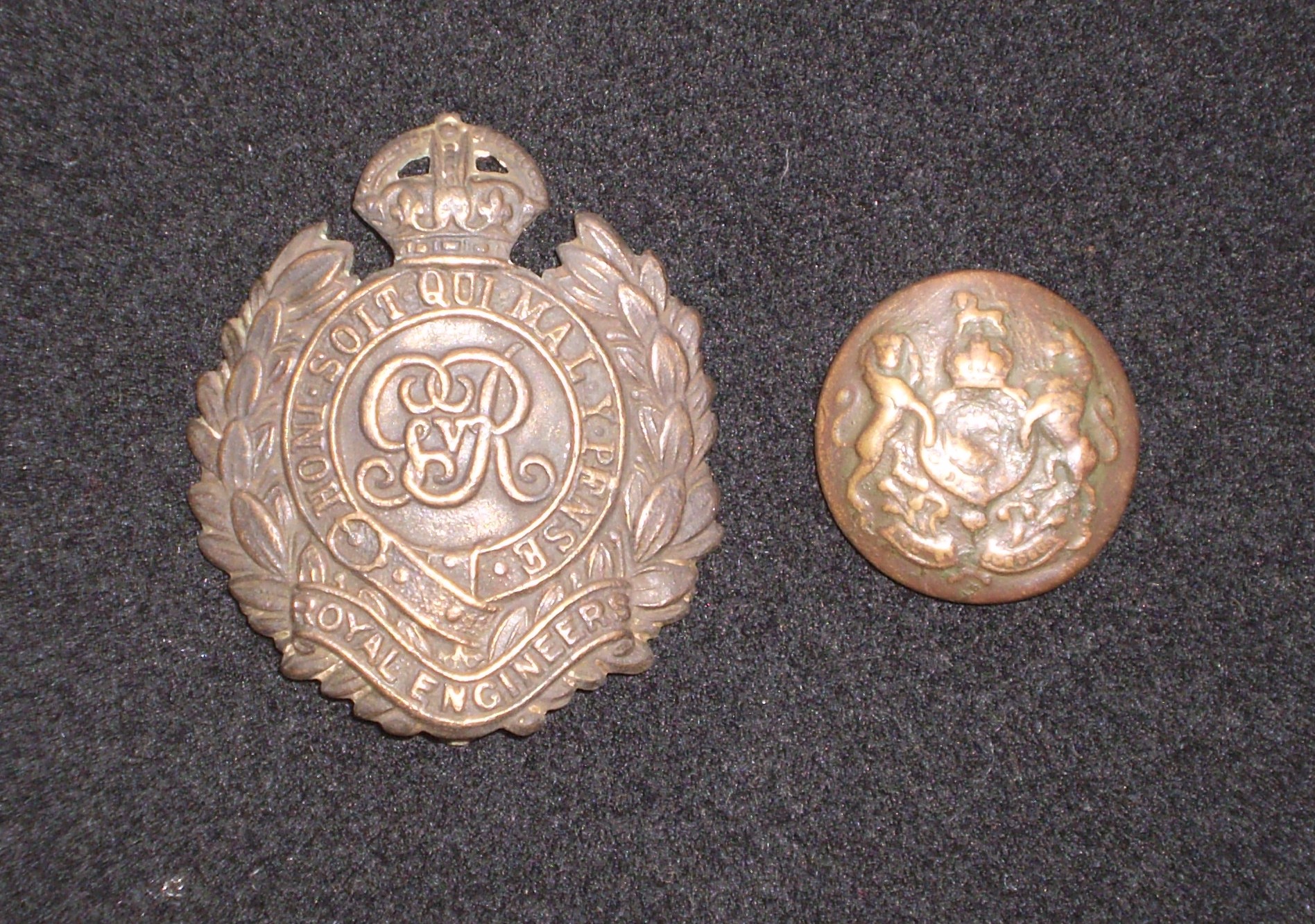Кокарда Королевского корпуса инженеров (железнодорожная миссия) и британская армейская пуговица чинов General Corps (общеармейская), найденные в Новосибирской области (из коллекции автора)