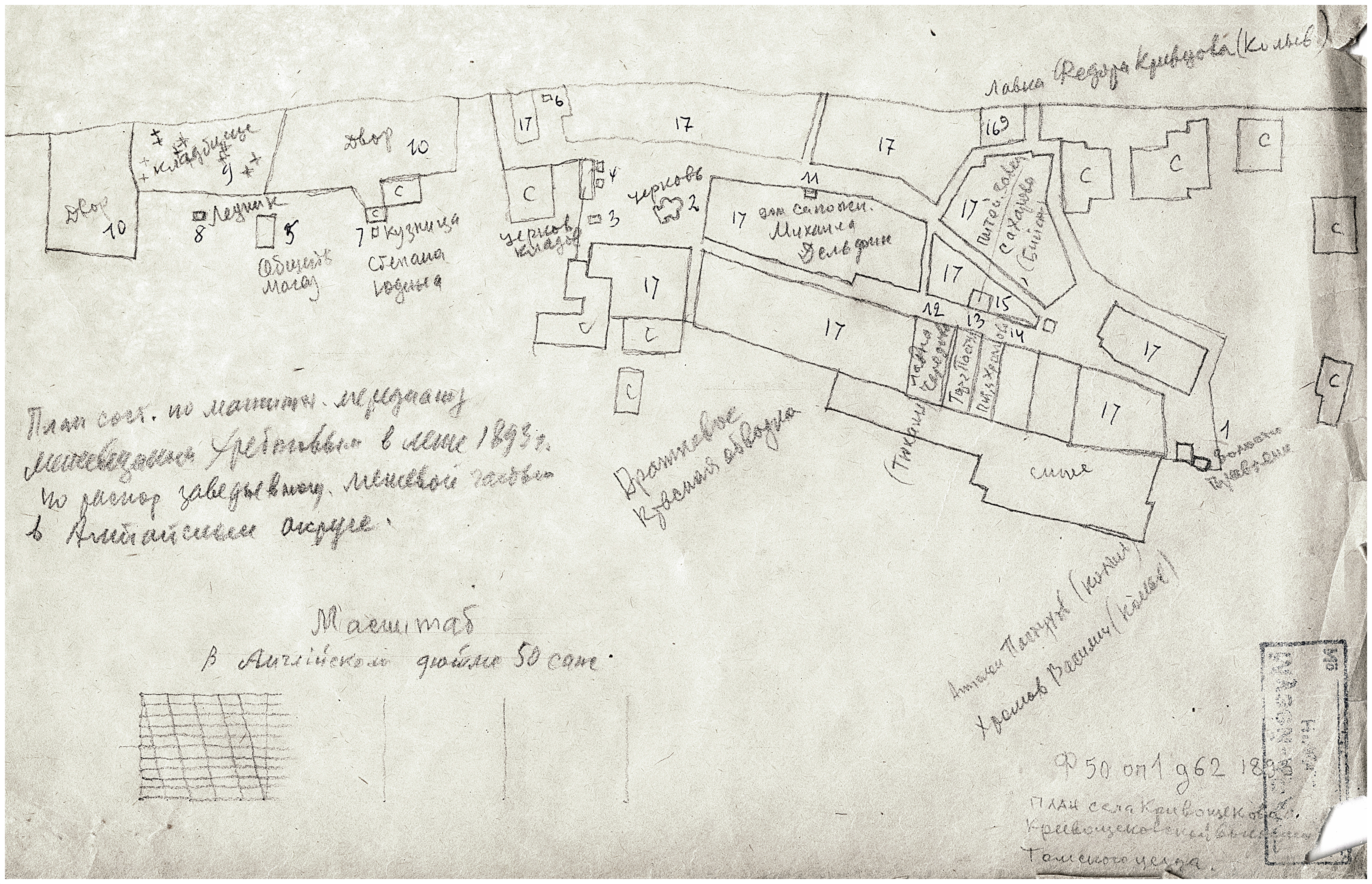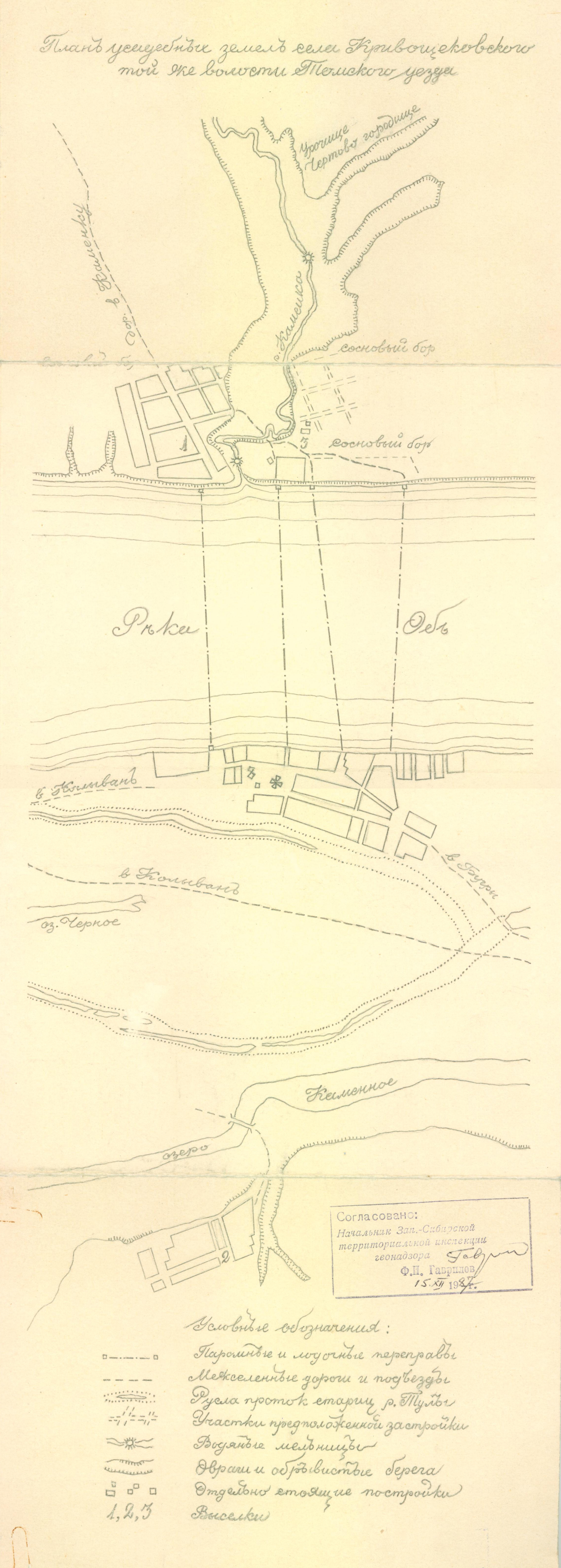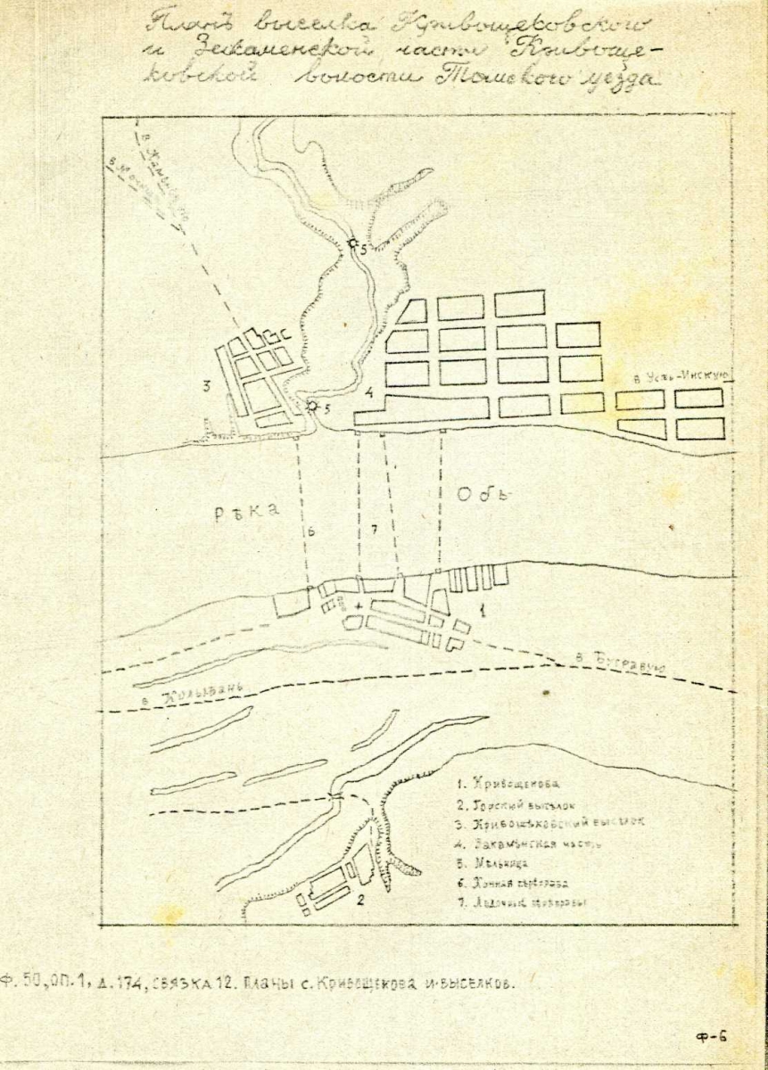 В Кривощёкова есть церковь, острог, двор приказчика, казенные амбары. Село уже выполняет некоторые административные функции и даже называется слободою (55). Название кривощёковского острога звучит во многих анкетах рабочих Колывано-Воскресенских заводов, поскольку через село лежал путь на каторгу сосланных пугачёвцев (56). Из сообщения Кривощёковской волостной избы в Чаусский волостной суд от 1 марта 1792 года мы узнаём имена подписавших его старосты села Тимофея Шмакова и писаря Петра Шитина, а также крестьянина Лариона Вешневецкого, освобождаемого от подушного платежа и мирских денег (57).