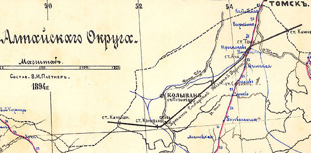 Тем не менее, наши краеведы говорят о гораздо более раннем начале проектирования. Так, Кузьма Зайцев пишет, что весть о постройке «чугунки» прокатилась по Московскому тракту еще в 1856-57 годах. Тогда же здесь появились первые геодезисты и топографы. «Когда на карте Сибири появилась сплошная линия железной дороги от Урала до Владивостока шел 1858 год» (110). К сожалению, в своем утверждении Кузьма Петрович не сослался на источник данной информации. Возможно, он имел ввиду «экспедицию из межевых чинов под начальством межевого инженера капитана Мейена I-го», Высочайшим повелением снаряженную в Алтайский горный округ в 1856 году (111). Но в задачи этой экспедиции не входил вопрос поиска пути для дороги. Работа экспедиции продолжалась 26 лет, до 1882 года и охватывала всю территорию округа - от Васюганских болот до Алтайской горной системы. Результатом работы стали несколько разномасшабных топографических карт округа, (в том числе десятиверстка, фрагмент которой представлен выше), а также обширный свод сведений о земельном устройстве и недрах края.