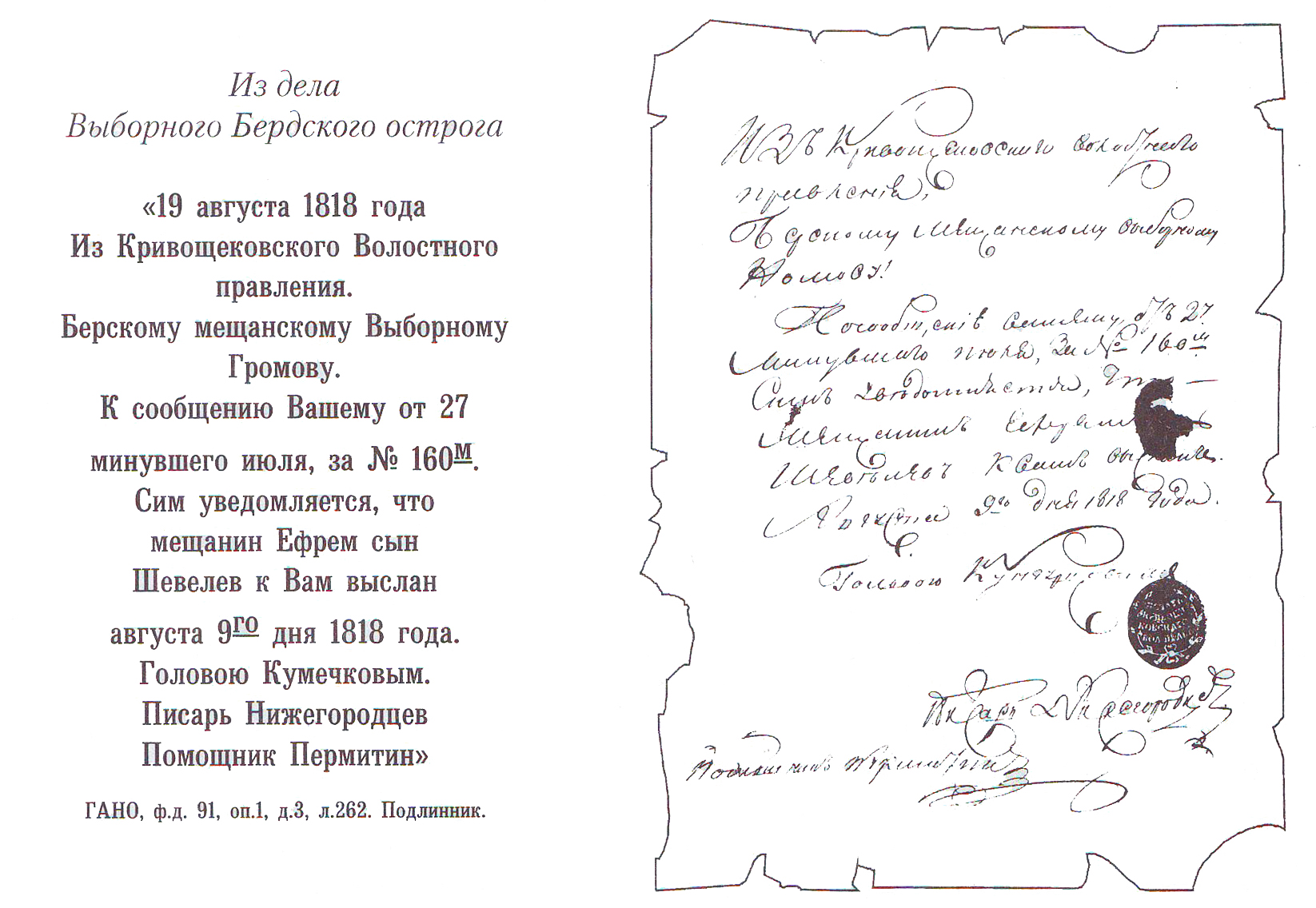В деле мещанского выборного Бердского острога Громова есть письмо от кривощёковского волостного правления от 19 августа 1818 года за подписью головы Кумечкова, писаря Нижегородцева и помощника Пермитина. Письмо скреплено той же печатью «Кривощековскаго вол правл» (70). А кривощёковский писарь мещанин Пётр Нижегородцев упоминается и у Садырова, но уже в 1832-м, как шельмовавший с рекрутскими списками и за то наказанный розгами и запрещенный «наймоваться писарем по всей Сибири в будущем» (71).
