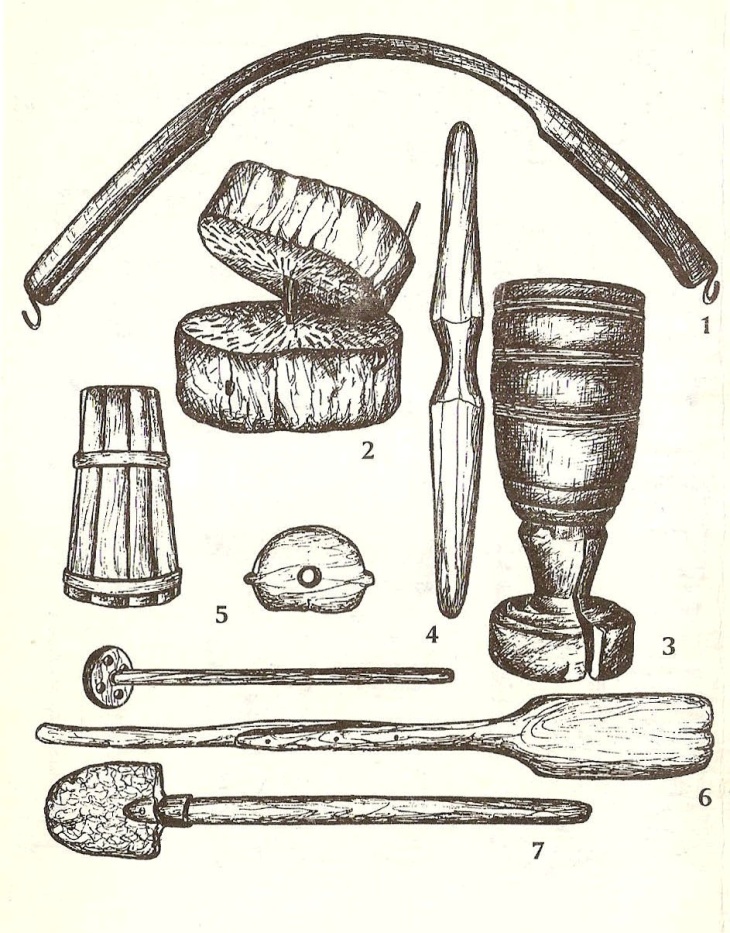 1 – коромысло; 2 – ручная мельница; 3 – ступа; 4 – пест; 5 – маслобойка с крышкой; 6 и 7 – лопаты.