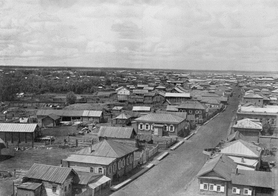 Большое старожильческое село в Верхнем Приобье – Камень-на-Оби. На центральной улице – административные, общественные и торговые здания, просторные дома зажиточных крестьян и купцов. Фото начала ХХ в.