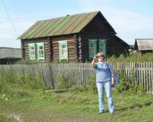 Пятистенок – один из самых распространенных типов традиционного жилища в Приобье. Современный вид в с. Юрт-Акбалык Колыванского района. Впереди – этнограф и музеолог О. Н. Шелегина