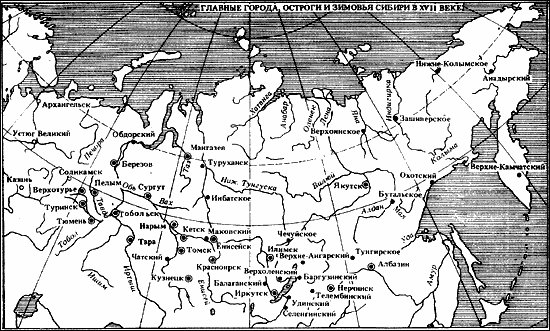 Карта «Главные города, остроги и зимовья Сибири в XVIII в.»