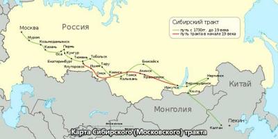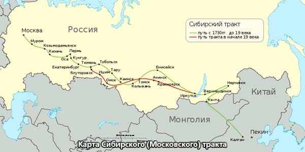 5. Посмотри на карту Московско-Сибирского тракта, найди и обозначь самые крупные города и ярмарки начала ХХ в. Также отметь путь Сибирского тракта с 1730-х гг. до XIX в. зеленым карандашом, а путь тракта в начале XIX в. – красным.