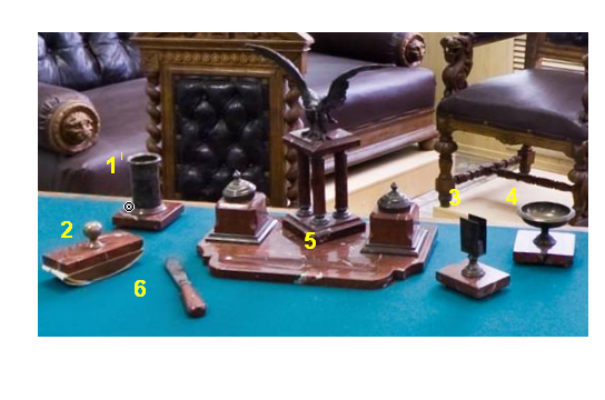 Ответ: 1 – подставка для карандашей; 2 – пресс-папье; 3 – подставка для спичек; 4) пепельница; 5 – желобок для ручки; 6 – нож для нарезки бумаги.