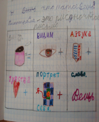 Пиктограмма – изображение, содержащее выполненное рисунками сообщение. Дети используют более простое определение: пиктограмма – рисуночное письмо или сообщение рисунком. При помощи пиктограмм даются определения на первых уроках, например такие как: окружающий мир, вещь, музей. Пиктограммы появляются в тетрадках постоянно и делают запоминание сложных терминов и определений простым. Яркие рисунки-схемы развивают воображение, побуждают к творчеству, тренируют память и образное мышление, учат выделять главное.