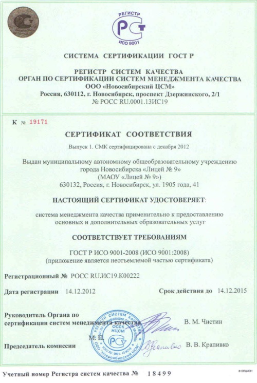 На данный момент педагогический коллектив МАОУ «Лицей № 9» создал и внедрил систему менеджмента качества (СМК), стал победителем конкурса на премию Правительства Новосибирской области за качество, в декабре 2012 года получил сертификат соответствия СМК применительно к предоставлению основных и дополнительных образовательных программ требованиям ГОСТ РИСО 9000-2008 (ИСО 9001:2008). В июне 2013 года лицей успешно прошел инспекционный аудит.