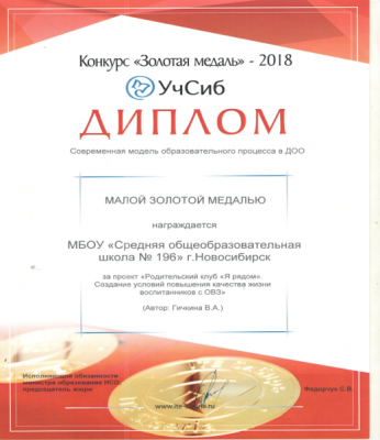 Данная программа родительского клуба «Я рядом» была представлена на конкурс «Золотая медаль» – 2018 УчСиб и была награждена малой золотой медалью.