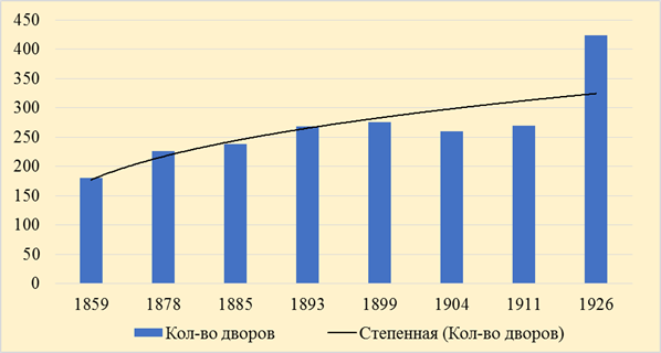 Взаимосвязь изменения численности населения и количества дворов прослеживается на всех этапах рассматриваемого периода: при росте численности населения растёт количество дворов, и наоборот. Однако на рубеже XIX–XX вв. наблюдались некоторые особенности. Так, момент спада 1899–1904 гг. характеризуется тем, что при возращении показателя численности населения к уровню 1859 г. количество дворов снизилось в меньшей степени. На следующем этапе 1904–1911 гг. на фоне внушительных темпов роста численности населения (111 % в год), темпы роста количества домохозяйств были незначительны (100,5 %). Напротив, с 1911 по 1926 г. количество дворов увеличилось в 1,6 раз, в то время как численность населения почти не изменилась.