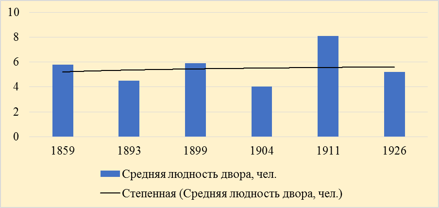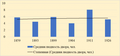 Гистограмма, помещенная на рисунке 2, наглядно демонстрирует, что увеличение и спад людности сменяли друг друга на протяжении всего рассматриваемого периода. Тем не менее, степенная линия тренда свидетельствует, что имела место незначительная тенденция к увеличению показателя. Наибольшее значение показателя людности двора зафиксировано в «Списке населенных мест» 1911 г., что можно связать с последствиями наплыва крестьян-переселенцев «столыпинской» волны 1906–1909 гг. Многие из них временно приселялись в домохозяйства старожилов, да и их собственные семьи в среднем были многолюднее старожильческих.