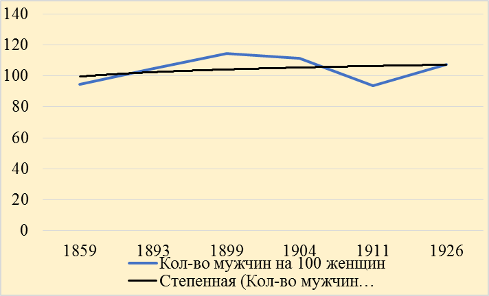 «Списки населенных мест» позволяют выявить количественное соотношение мужской и женской частей населения. Представим динамику этого соотношения на графике с добавленной степенной линией тренда (рис. 3).