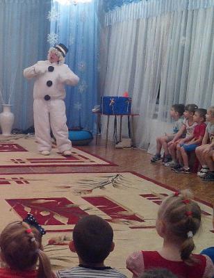 Снеговик благодарит детей, прощается и приглашает детей погулять на улице и поиграть там в снежки.