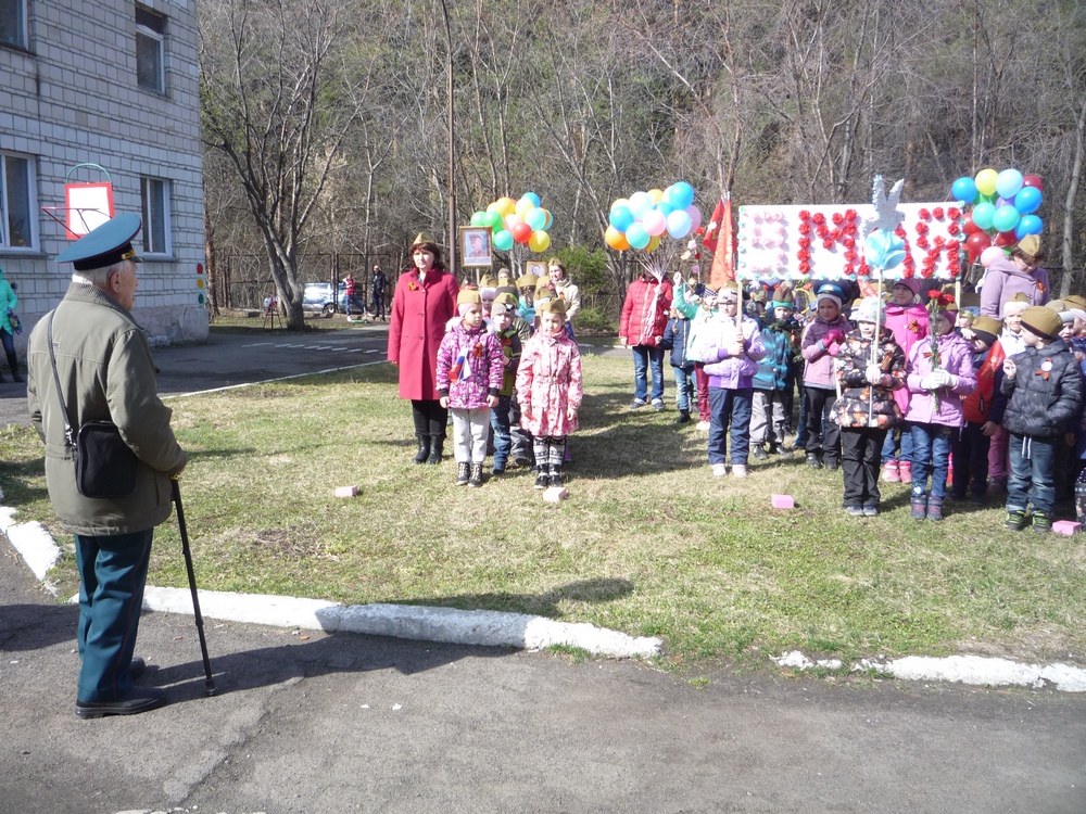 Педагоги нашего учреждения проводят много мероприятий, позволяющих формировать у детей уважительное отношение к истории страны, а встречи с ветеранами Великой Отечественной войны уже вошли в традицию. Дети с увлечением слушают рассказы ветеранов о героическом прошлом, готовят концертные программы, поздравительные открытки. По просьбе Совета ветеранов посещают на дому ветеранов ВОВ и тружеников тыла в дни их рождения. Еще несколько лет назад мы сотрудничали с 12 ветеранами ВОВ, на сегодняшний день их, увы, осталось два. Это Горьковский Петр Андреевич и Мезин Михаил Алексеевич. О Горьковском П.А. снят фильм, где было отражено сотрудничество с ребятами нашего детского сада. В фильм вошли кадры с нашего Парада Победы в ДОУ.