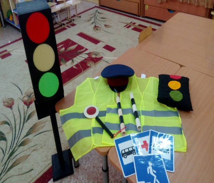 – Атрибуты для сюжетно-ролевых игр (жезл, свисток, фуражка, жилеты, макет светофора, дорожные знаки).
