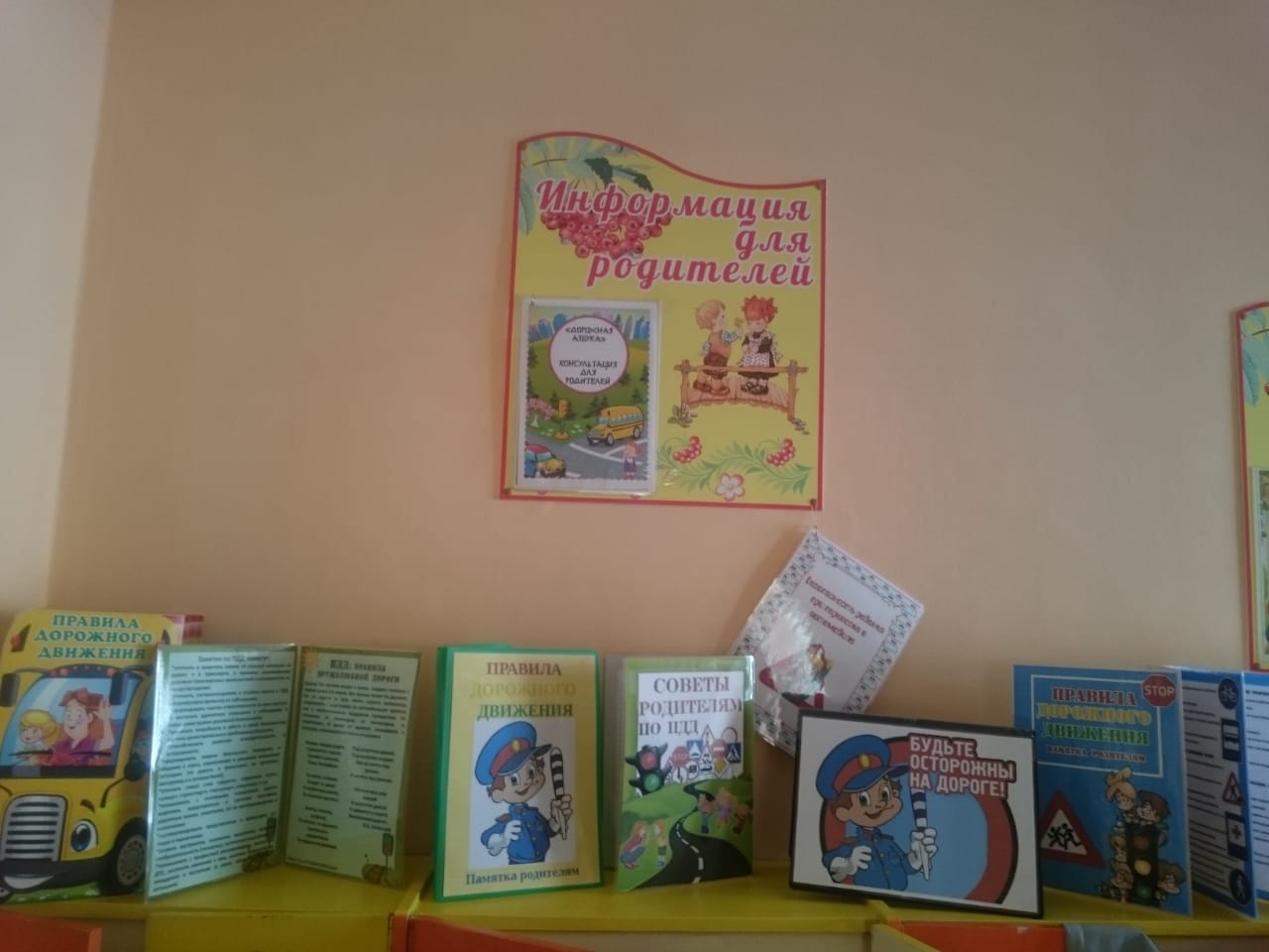 Самыми первыми и главными воспитателями и учителями у детей являются их родители. В уголке для родителей выкладываются консультации по ПДД, папки-передвижки, буклеты. А также проводятся родительские собрания, так как работа по освоению детьми правил дорожного движения должна проходить во взаимосвязи с семьей.