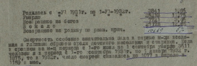 Не поддается осмыслению такая ненависть власти к народу, никакой экономической целесообразностью убийство нельзя оправдать! Согласно официальной статистике, в 1932 году в стране было 1 317 022 спецпереселенцев, из них умерли 89 754 человек. В архивном отчете директивным органам «О работе СибЛага по хозяйственному освоению спецпереселенцами Нарыма за время с мая 1931 по июнь 1932 г.» (см. фрагмент ниже) приводятся страшные сведения об «убыли», особенно среди детей и стариков: ежемесячно в нарымских болотах умирало по нескольку тысяч человек. А всего за год умерло 25 213 душ!