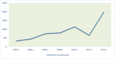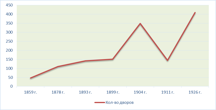 По таблице 1 и диаграмме, помещенной ниже на рисунке 2, мы можем увидеть, что количество дворов в Коченёво на протяжении 1859–1904 гг. росло. Но на этапе 1904–1911 гг. число домохозяйств сократилось на 205 единиц. Однако затем на этапе 1911–1926 гг. количество дворов стремительно увеличивается. За 67 лет, с 1859 по 1926 г., количество домохозяйств в Коченево увеличилось в 8,7 раз, в том числе за 1911–1926 гг. – в 2,8 раза. Среднегодовые темпы роста количества дворов за весь изучаемый период равнялись 103,2 %.