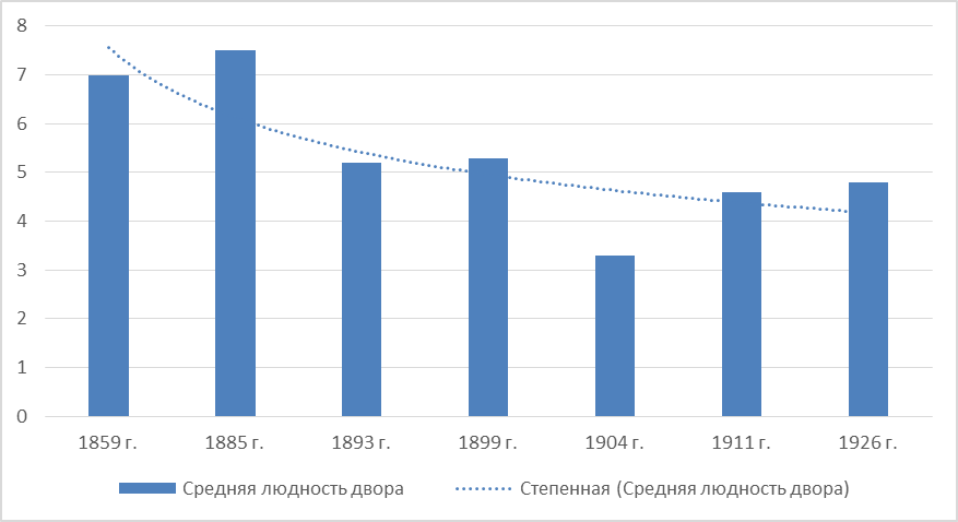 В промежутках между волнами массовых переселений людность дворов сокращалась, а самый низкий показатель приходится на 1904 г. В период модернизации аграрного общества такое сокращение является логичным, так как большие деревенские семьи чаще, чем раньше, разделяются, упрощают свой состав.
