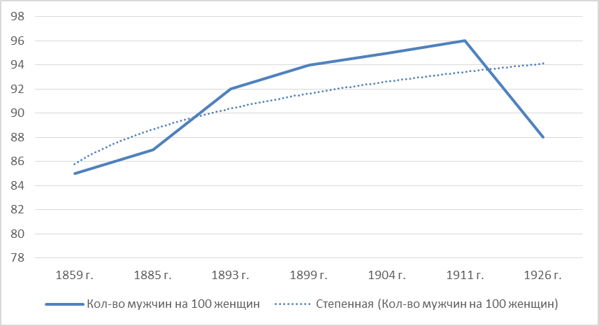 Можно заметить, что менялось и количественное соотношение мужской и женской частей населения в Коченёво. График на рисунке 5 показывает, что на протяжении всего изучаемого периода женщин было больше, чем мужчин, хотя сильного разрыва в соотношении полов не наблюдалось. Постепенно доля мужчин возрастала, о чем свидетельствует степенная линия тренда на графике. Это повышение было связано с упомянутыми выше миграционными процессами (в переселенческой среде численно преобладали мужчины), а также с расположением Коченёво на железной дороге, работа на которой привлекала мужское население из сельской округи. Заметное сокращение доли мужского населения в начале ХХ в. легко объяснить гибелью мужчин в пожарах революционных и военных событий этого времени.