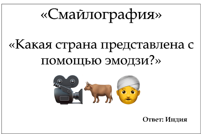 Смайлография. С помощью эмодзи можно шифровать не только эмоции и чувства, но и много другое, например, страны, песни, фильмы, школьные дисциплины, поговорки, личности и даже события.
