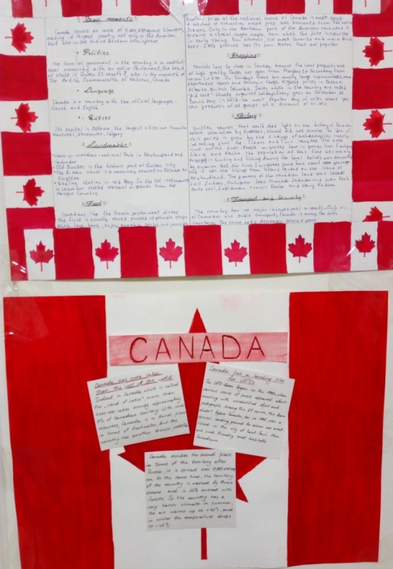 При составлении подробного плана фестиваля было решено задействовать все параллели. Для учащихся гимназии был подготовлен и проведен ряд мероприятий. Каждая группа выпустила по несколько стенгазет на всех языках, изучаемых в гимназии в едином формате. Газеты содержали страноведческий материал об одной из англоговорящих стран, и фоном каждой служил флаг данной страны. Казалось бы, устаревшая форма. Было решено, что к каждому уроку учащиеся ищут материал по отдельно взятой стране изучаемого языка и в начале урока рассказывают вкратце свою информацию, не более 3-5 предложений. Сначала искали сведения о Великобритании, затем Австралии, США, Канаде и бывших английских колониях. Это позволило работать над достижением метапредметных результатов – представление об особенностях образа жизни, быта, культуры стран изучаемого языка (всемирно известных достопримечательностях, выдающихся людях и их вкладе в мировую культуру), представление о сходстве и различиях в традициях своей страны и стран изучаемого языка.