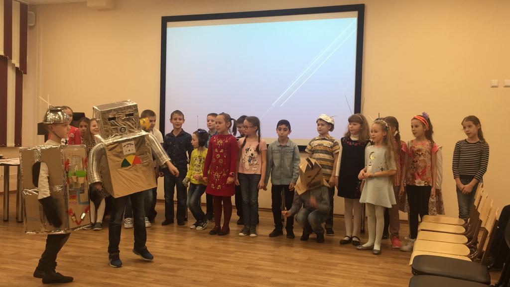 Все идут за роботом, песенку поют.