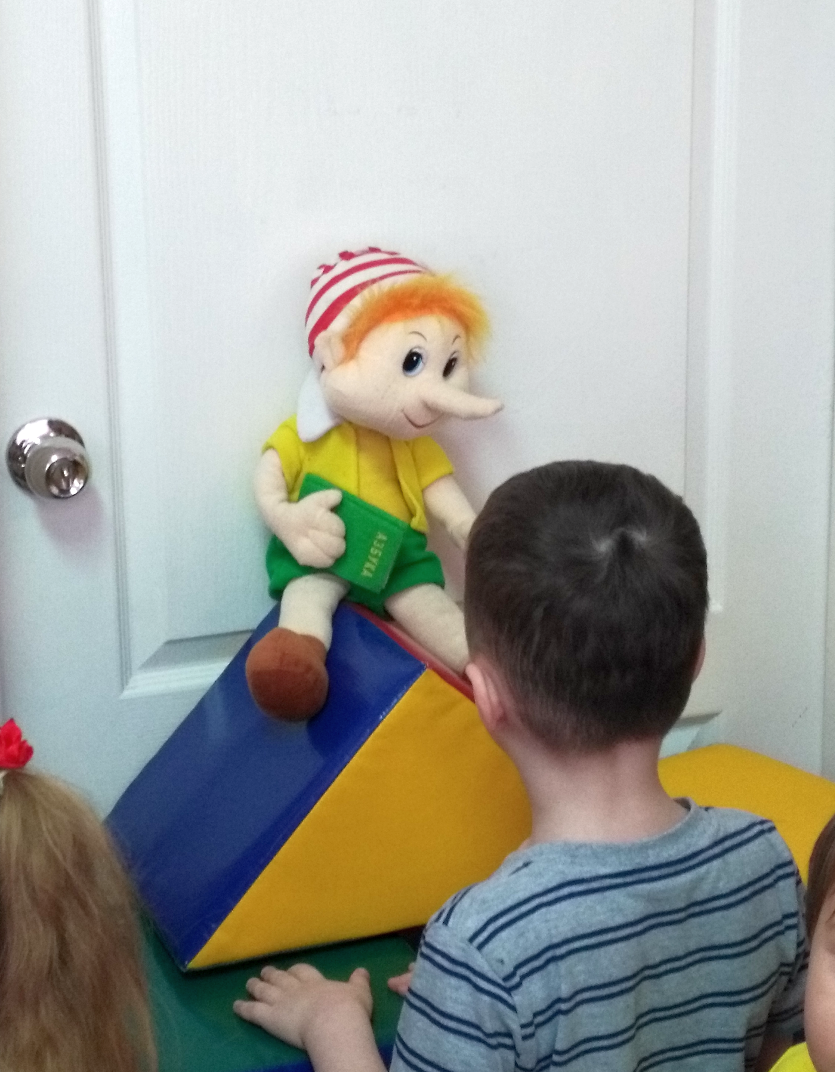 На карте дети ищут куда ведет стрелка дальше. Находят, что следующее задание лежит в мягких модулях, Дети ищут в группе, большие мягкие модули, подходят к ним. На модулях сидит буратино, а в руках у него конверт с заданием.
