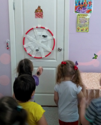 (По ковру раскиданы шарики из ваты (мухи), напротив стоит обруч, обклеенный скотчем в виде паутины, дети должны кидать в него шары (мух)).