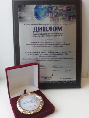 Проект «Искусство без границ» получил общественное признание на городском конкурсе «Инновации в образовании 2019» – лауреат районного этапа (январь 2019 года, город Новосибирск), лауреат Всероссийского конкурса «Новаторство в образовании» в номинации «Самый успешный проект – 2019» (февраль 2019 года, город Санкт-Петербург).
