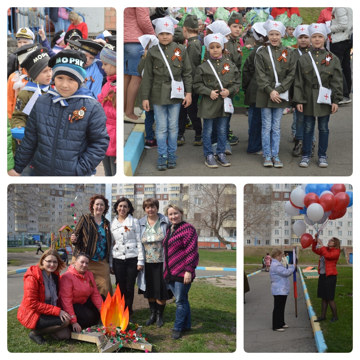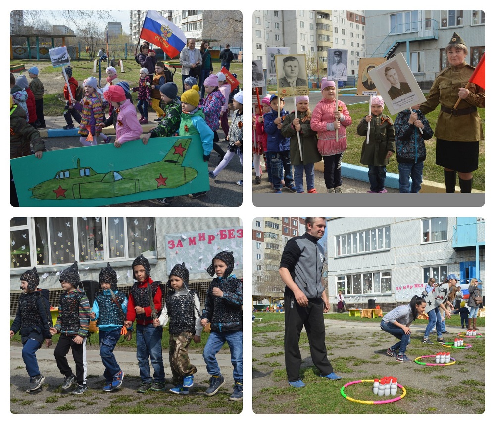Все 12 групп детского сада занимались сборами и изготовлением атрибутов, плакатов, костюмов. Воспитатели младших и средних групп вместе с родителями и детьми изготавливали голубей на палочке и яркие пышные веточки с весенними цветами. Родители детей старших групп готовили портреты своих воевавших родных для создания «Бессмертного полка». А ребята подготовительных групп стали олицетворением основных родов войск: танкисты, морские пехотинцы, лётчики. Приятно было увидеть на параде целый отряд медицинской части (детям сшили медицинские сумки, косынки и повязки), а другая группа стала отрядом барабанщиков. Также общими усилиями был изготовлен Вечный огонь.