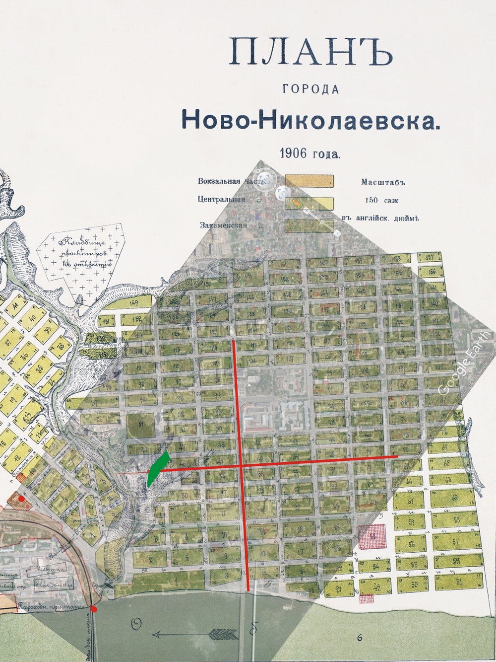 Рис. 6, 7. Наложение современной схемы Новосибирска на план 1906 г.