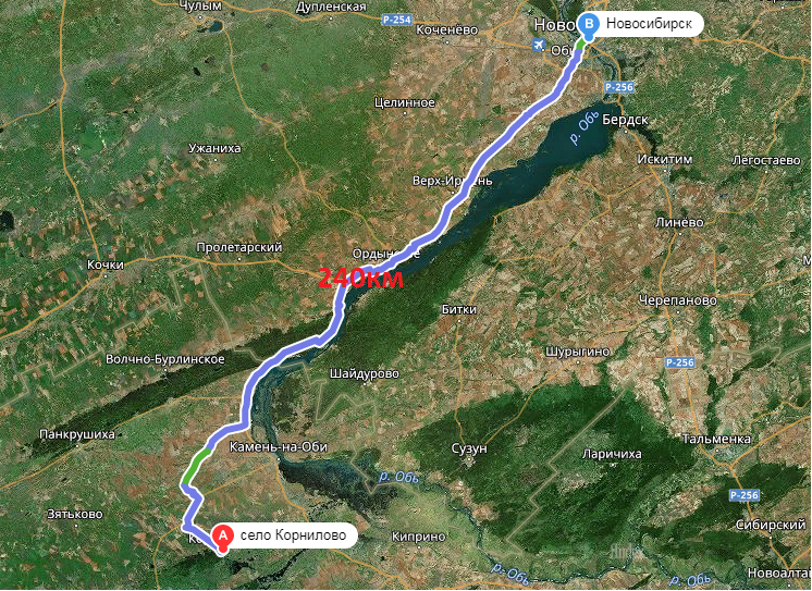 Рис. 1. Положение села Корнилово относительно Новосибирска на современной карте