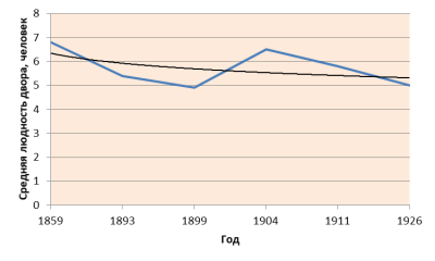 В связи с тем, что количество домохозяйств росло быстрее численности населения, в изучаемый период происходило сокращения средней людности домохозяйств (дворов) в Корнилово. Генеральная тенденция такого сокращения ясно обозначена линией степенного тренда на рисунке 4. Генеральная тенденция нарушается всплеском людности, приходящимся на конец XIX – начало ХХ в. Нам представляется, что главной причиной этого всплеска стало переселенческое движение крестьян из Европейской России в наш край, которое наиболее массовым стало в годы Столыпинской аграрной реформы. Многие новоселы не могли сразу позволить себе завести собственное хозяйство, поэтому они приселялись к хозяйствам зажиточных старожилов, увеличивая их людность. Но и сами по себе переселенческие семьи были в среднем несколько многолюднее, чем старожильческие, как установлено историками. В промежутках между волнами массовых переселений людность дворов сокращалась, а самый низкий показатель приходится на 1899 г.