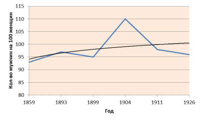 Можно заметить, что менялось и количественное соотношение мужской и женской частей населения в Корнилово. График на рисунке 5 показывает, что на протяжении всего изучаемого периода женщин, как правило, было больше, чем мужчин, хотя сильного разрыва в соотношении полов не наблюдалось. Постепенно доля мужчин возрастала, о чем свидетельствует степенная линия тренда на графике. В 1904 г. доля мужчин временно заметно превысила удельный вес женщин, но затем женское население снова стало численно доминировать. Повышение доли мужчин в населении, вероятно, было связано с упомянутыми выше миграционными процессами (в переселенческой среде численно преобладали мужчины), а также с наличием в Корнилово немалого количества «заводов» – так называли здесь небольшие промышленных производства, работа на которых привлекала мужское население из сельской округи. В годы политических потрясений начала ХХ в. сильнее всего пострадало мужское население, и его удельный вес в Корнилово, как и в большинстве других населенных пунктов России, сильно сократился.