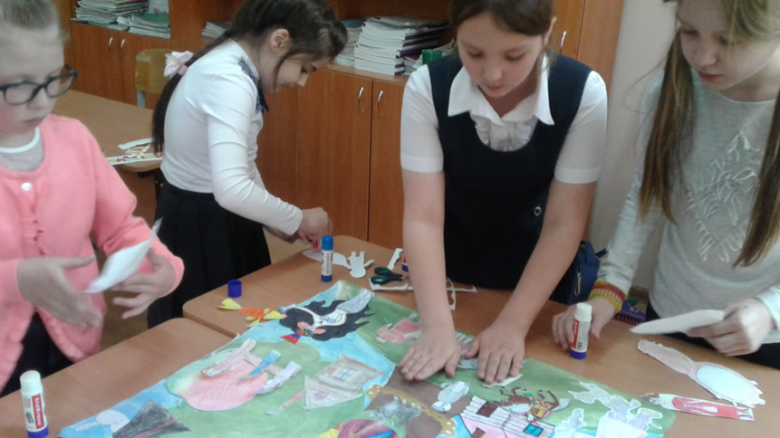 Следующий этап в создании открытки – организационный. В какой технике выполнить открытку, чтобы каждый внёс свою лепту? Решили остановиться на коллаже. Коллаж – прием в изобразительном искусстве, заключающийся в наклеивании на какую-либо основу материалов, отличающихся от нее по цвету и фактуре. Для этого все ученики разделились на пять групп – по количеству самых знаменитых сказок Пушкина. «Мозговой штурм» предполагал: каждой группе необходимо было вспомнить героев и предметы, которые характеризовали сказку. Все ученики получили домашнее задание – нарисовать этих «героев». На следующий день девочки нарисовали основу для открытки и приклеили всех живых и неживых героев сказки.