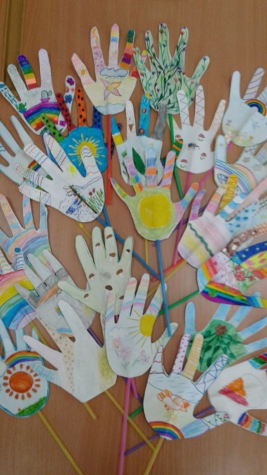 На уроке технологии мы придумывали «летние ладошки». И у ребят появилась новая идея по созданию открытки. Если первый вариант открытки мы решили использовать для важного дела – поместить её 6 июня на стенде в школьном лагере, то второй вариант открытки – только смогли запечатлеть на фотоаппарате. Мы не расстроились, зато проявили креатив – способность человека принимать творческие решения и создавать принципиально новые идеи.