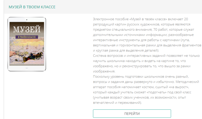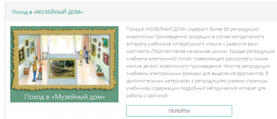 Программа «Музей в твоём классе» реализует художественно-эстетическое и научно-познавательное направление. Здесь предусматривается подготовка ребёнка к восприятию живописных произведений, пониманию символики и языка искусства.