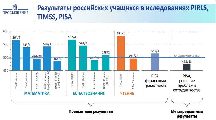 Из данной диаграммы видно, что у российских школьников высокие предметные результаты. А вот метапредметные результаты гораздо ниже международного среднего балла. Это значит, что подростки не умеют пользоваться арсеналом знаний в новых, незнакомых, нестандартных ситуациях. «А при чем здесь младшие школьники?» – спросите вы. Ответ прост. Эти дети, которые были когда-то в начальной школе и получали знания, но не научились их добывать самостоятельно.