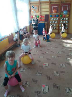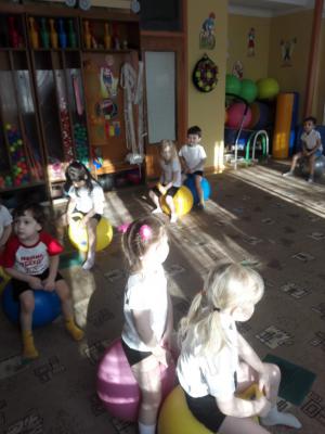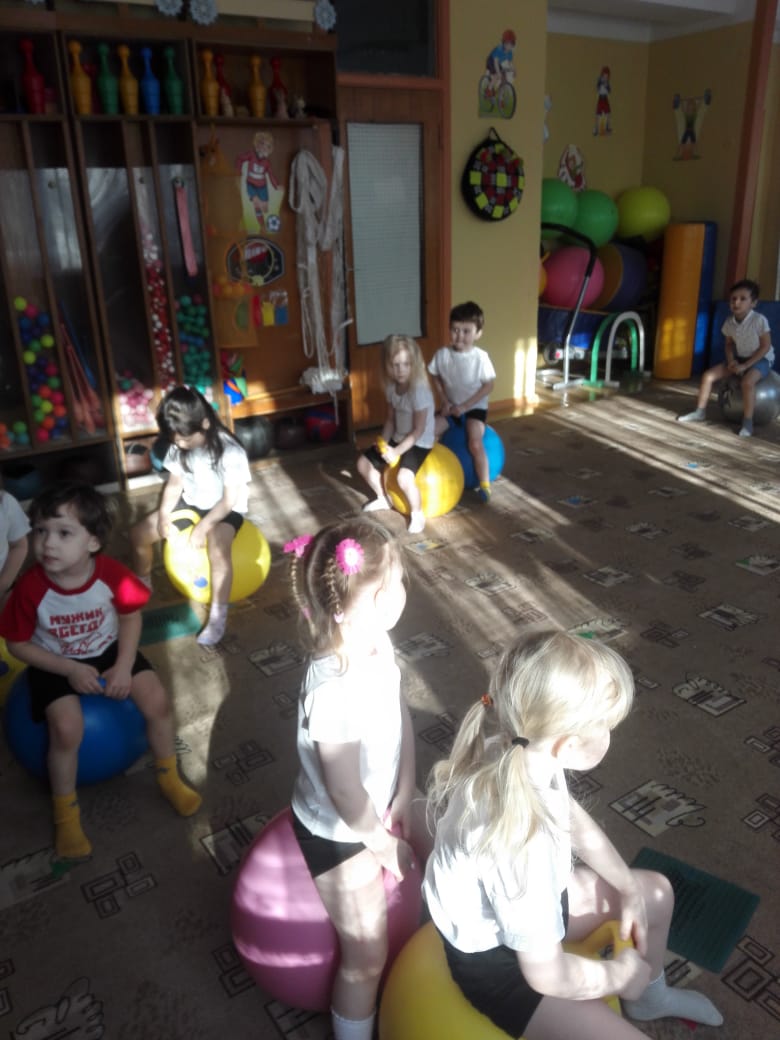Посмотрите, ребята, а вдоль нашей тропинки лежат большие разноцветные колобки. Давайте попробуем с ними подружиться и поиграть. (Дети садятся на большие резиновые мячи и выполняют комплекс упражнений под музыку).