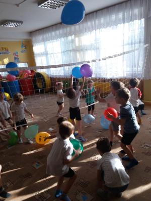 Ребята, а теперь мы с нашими колобками сделаем воздушный перелет в страну Хохотанию. (Дети двумя руками перекидывают мяч через сетку, в игру добавляются воздушные шарики, дети делятся на две команды и за 10 секунд стараются перекинуть мячи на сторону противника).