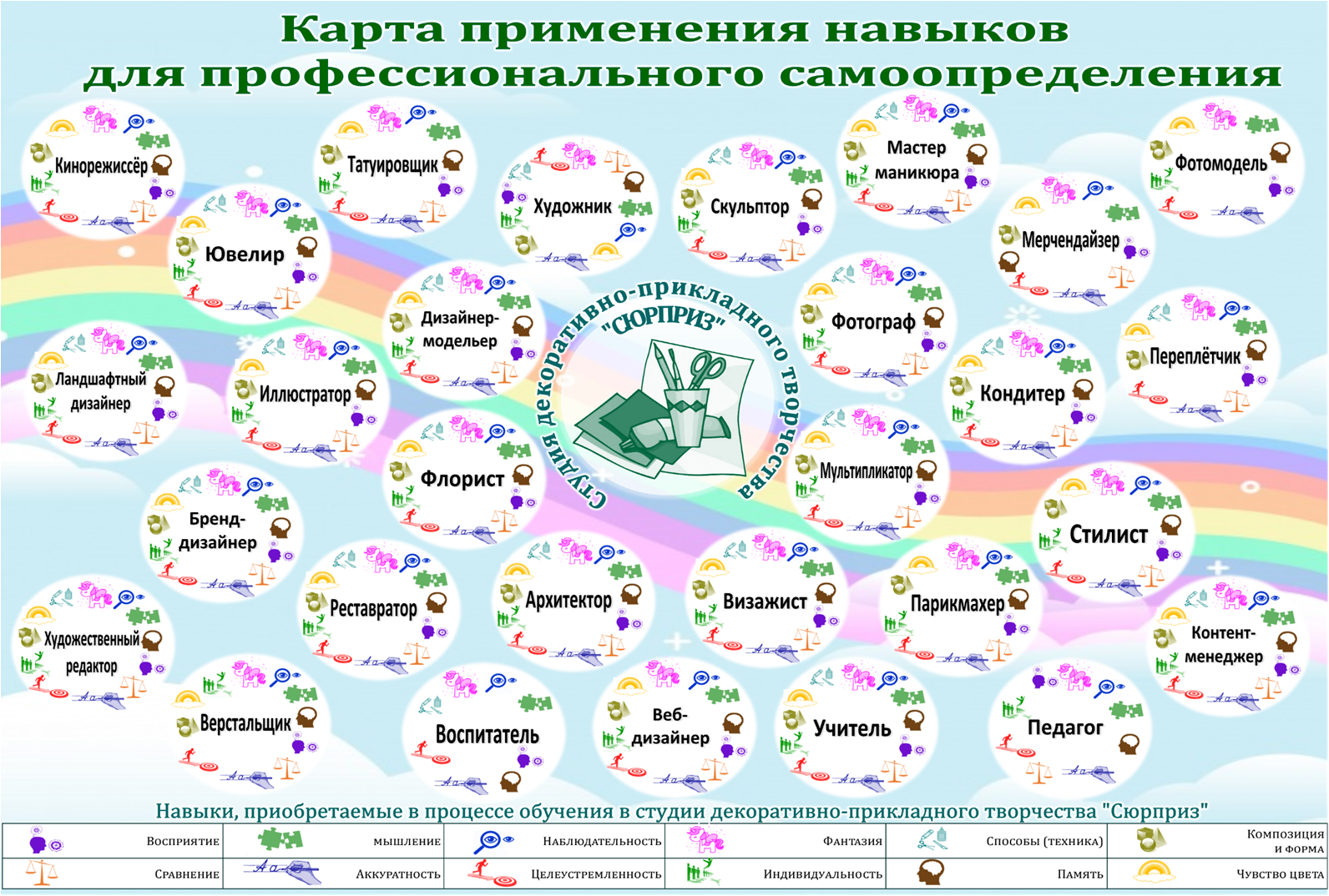 На следующем этапе были подобраны профессии с набором получаемых в объединении компетенций. В итоге получилось наглядное пособие, которое мы назвали «Карта применения навыков для профессионального самоопределения». Карта выполнялась для каждого объединения.