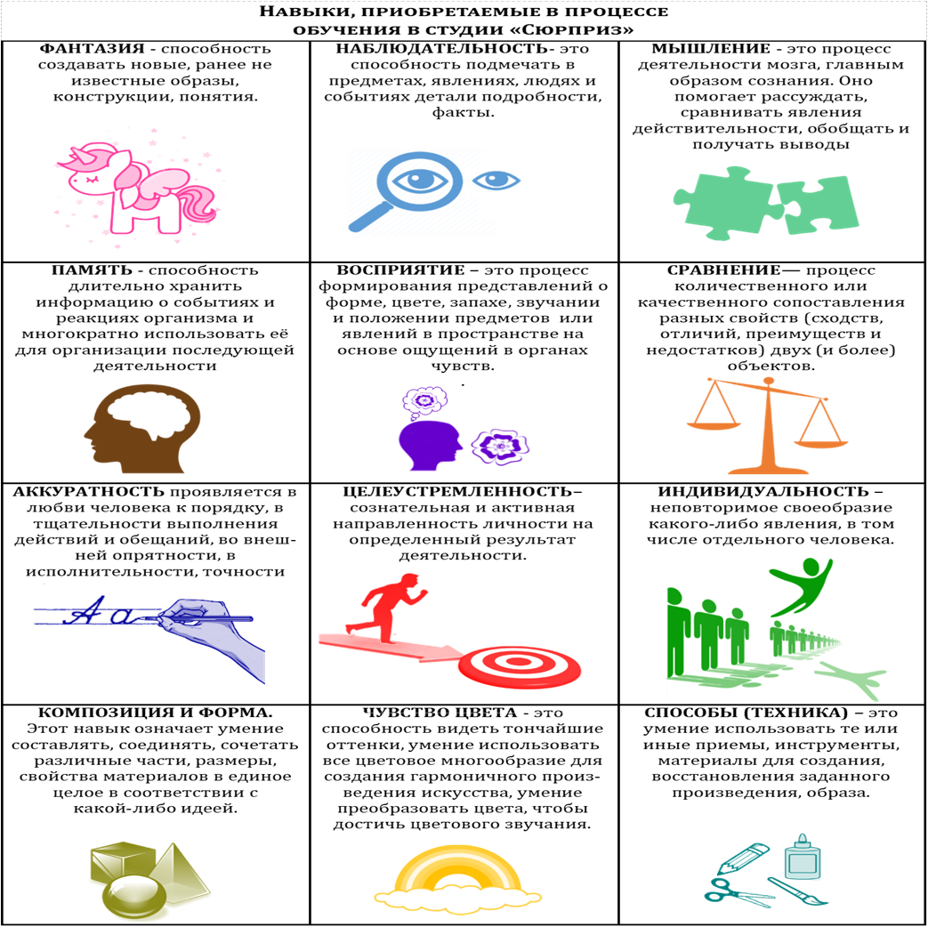 Работа велась с каждым педагогом индивидуально, сначала были перечислены навыки, отрабатываемые в объединении. Далее мы подбирали способы отработки навыков и их диагностирования. Навыки с прописанными определениями размещались в таблице и обучающиеся переводили каждое понятие в знаковую систему, по подобию сайта «Атлас новых профессий» – это альманах перспективных отраслей и профессий на ближайшие 15–20 лет. Новые профессии, представленные на этом сайте, требуют новых «надпрофессиональных» навыков, и эти навыки разработчики сайта перевели в знаковую систему. И мы также прорисовали, перевели все отрабатываемые навыки в объединении в картинку – знак, понятный обучающимся и педагогам.