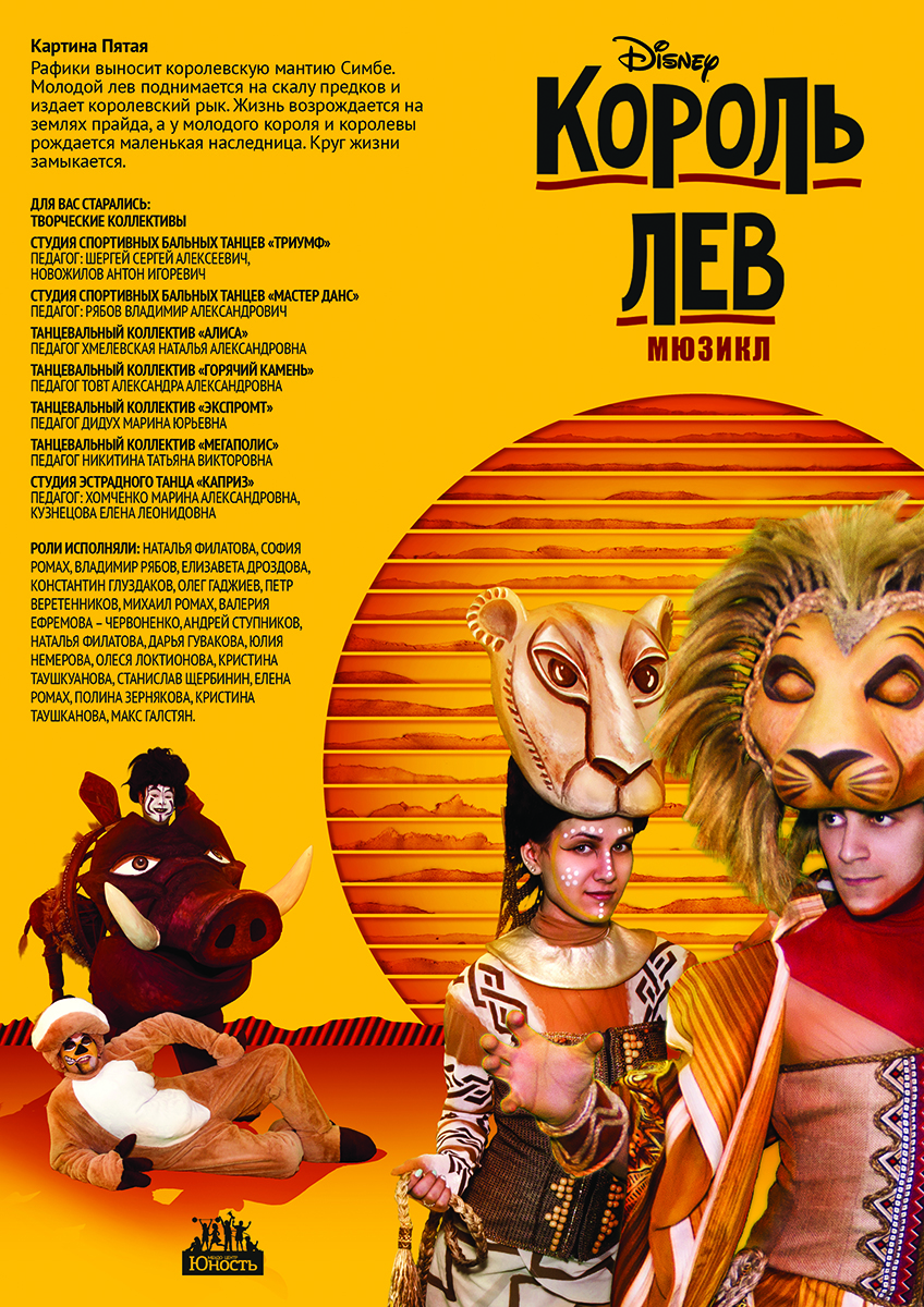 Проект «Мюзикл – для нас единое целое» является эффективной моделью сотрудничества педагогов, детей и родителей, которая позволяет решить проблему формы организации совместной деятельности для всех участников образовательного процесса. К результатам проекта можно отнести непосредственное создание собственного уникального, многоэтапного, творческого, театрального «арт-продукта» – мюзикла «Король лев», включающего в себя создание авторских костюмов и декораций, вокальных и танцевальных номеров, создание презентационного материала, видеофильма и т. д.