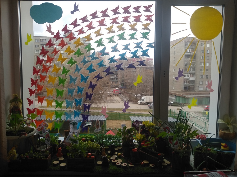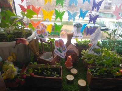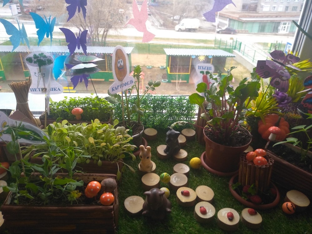 Кроме постоянных растений в уголке природы у нас имеются и временные объекты природы, например, мини-город на окне – лук, чеснок, овес и др. культуры, выращиваемые в ящиках в холодное время года. Особенно важны лук и чеснок – витаминная добавка в питание детей. Кроме того, эти растения выделяют фитонциды и тем самым оздоравливают воздух помещения. Традиционно весной у нас реализуется педагогический проект «Зеленый мир на окне», где мы с детьми выращивает цветочную и овощную рассаду для цветников и огорода.