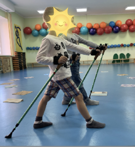 2. «Шагаем с палками». Дети шагают по кругу с палками для скандинавской ходьбы, совершая перекрестные движения: правая рука-левая нога и наоборот.
