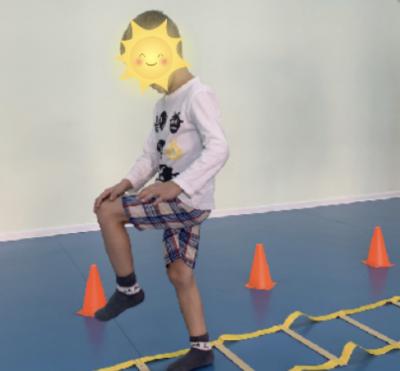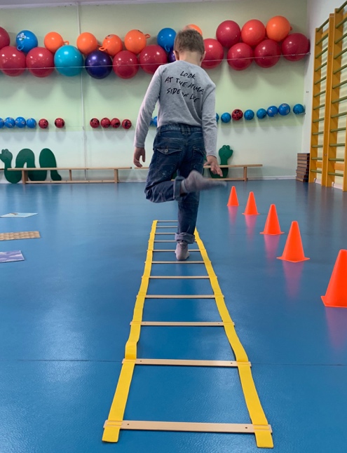 3. «Шагаем и стихи повторяем». Дети шагают перекрестными шагами, касаясь кистью руки противоположной стопы, по «координационной лесенке» и рассказывают стихотворение, потешку или поют песенку.